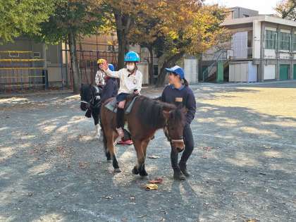 最初は恐る恐るポニーにまたがっていた1年生でしたが、慣れてくると片手を離して手を振ったり、両手を離してポーズを決めたりして、最後には息ぴったりの様子でした。