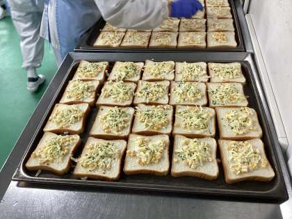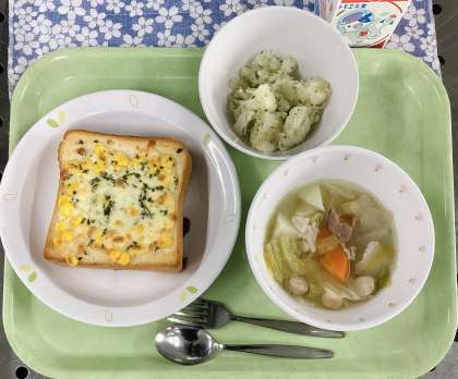 今日は、マヨコーントースト、青のりバターポテト、ポトフ、牛乳です。