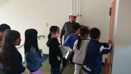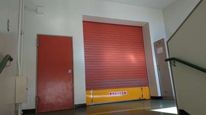 今日の避難訓練は、「火事」の想定で防火シャッターが下りて防火扉を通って避難をしました。