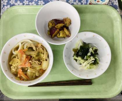 今日は、カレーうどん、野菜の甘酢かけ、大学いも、牛乳です。