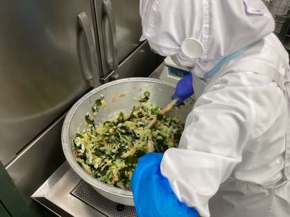 野菜の甘酢かけは、お酢や砂糖、一味唐辛子を加えたドレッシングを野菜にかけています。写真のように、調理員さんがしっかり混ぜて味が均一になるようにしてくれました。