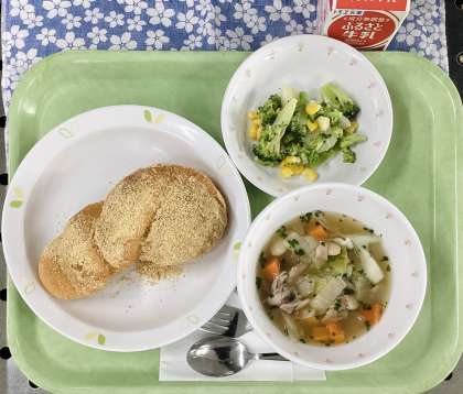 今日は、ごまきなこあげパン、ブロッコリーのサラダ、白いんげん豆の田舎風スープ、牛乳です。