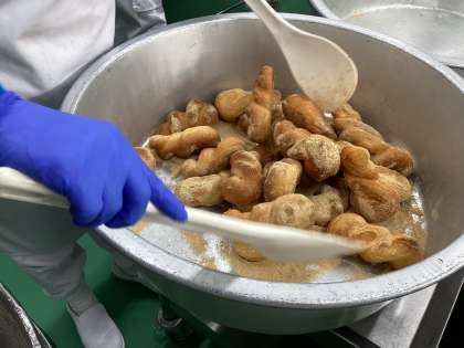 ごまきなこあげパンは、白すりごまときなこ、砂糖を混ぜたものを揚げたパンに絡ませて作ります。