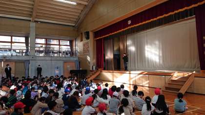 今日の全校朝会は、校長先生から「2学期も残りあと1月となったので『振り返る』ということ」についてお話がありました。