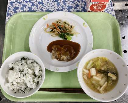 今日は、わかめごはん、鶏肉のゆず味噌焼き、野菜のからしじょうゆあえ、白菜と油揚げのみそ汁、牛乳です。