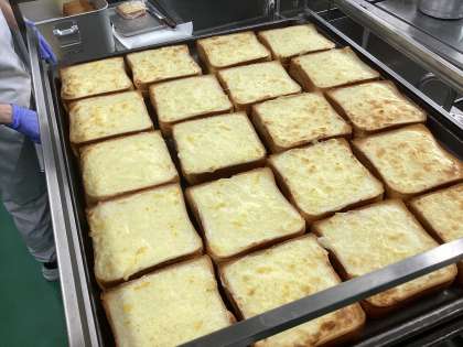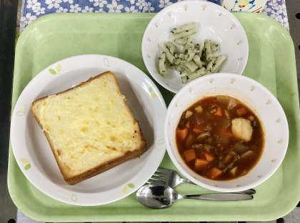 今日は、クリームチーズトースト、魚介のブイヤベース風、和風ジェノベーゼソテー、牛乳です。