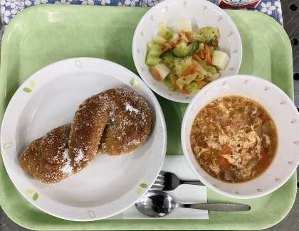 今日は、かわりあげパン、ポテト入りフレンチサラダ、トマトとたまごのスープ、牛乳です。