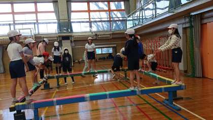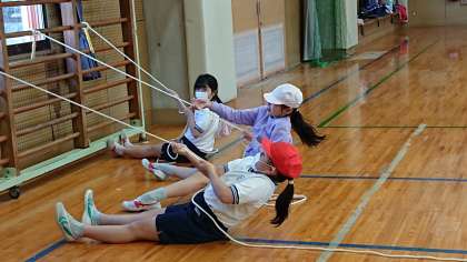 全体共有してからの再チャレンジなので、体の動かし方、使い方、用具の工夫で活発な動きが見られました。