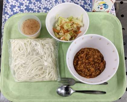 今日は、ソフト麺ミートソース、じゃがいものハニーサラダ、ブラマンジェ いちごソース、牛乳です。