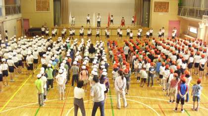 運動会に向けて、応援団がステージに上がり「運動会の歌」を全員で歌いました。