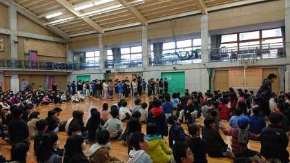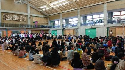 今日の音楽朝会は、体育館に全学年集合して〜リコーダーフェスティバル〜です。