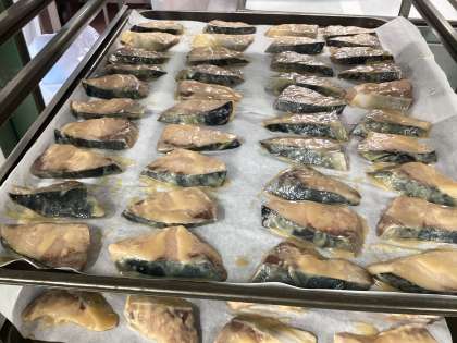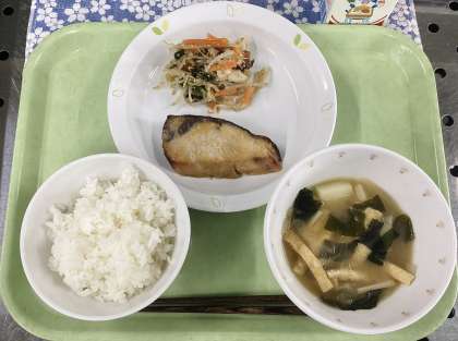 今日は、有機米ごはん、魚の西京焼き、ちくわと野菜のごまあえ、じゃがいもと油揚げのみそ汁、牛乳です。