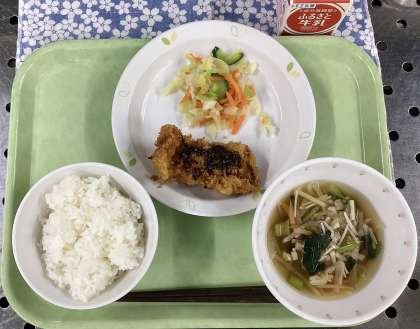 今日は、ごはん、いか味噌カツ、野菜のひとしお、沢煮椀、牛乳です。