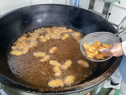 写真のように、揚げ終わりは、温度確認をしっかり行います。