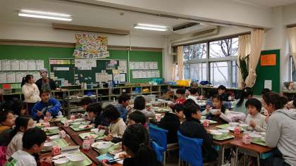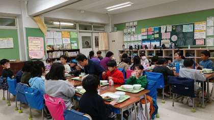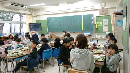 今日は、地域の方と「むかし遊び」交流をした流れで給食も各教室で一緒にいただくという給食交流を行いました。