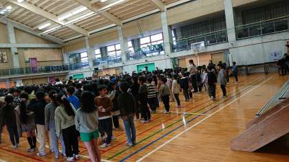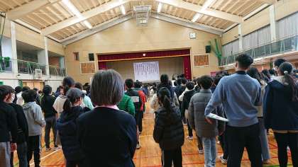 今日は、音楽朝会で体育館に1〜6年生まで集合しました。