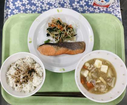 今日は、麦ごはん、手作りふりかけ、鮭のレモン風味、野菜のゆずこしょうあえ、豚汁、牛乳です。
