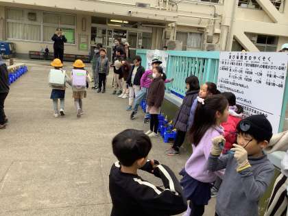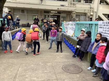 悪天候の日も、校舎に入ってきた児童に、元気で明るいあいさつをし、学校の中では、晴れ晴れしい雰囲気で溢れていました。