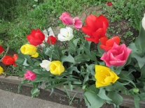 いろとりどりのチューリップ、菜の花、エンドウの花などが