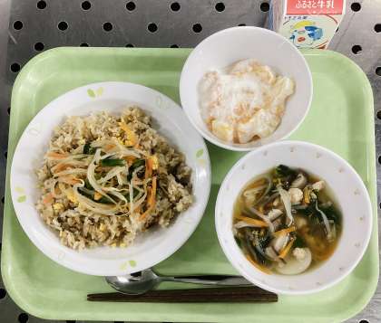 今日は、ビビンバ、トックスープ、フルーツヨーグルト、牛乳です。
