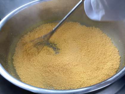 写真は、炒り卵を作っているところです。