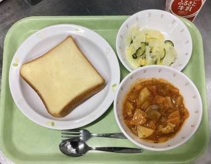 今日は、ハニーミルクトースト、イタリアンドレッシングサラダ、トマトシチュー、牛乳です。