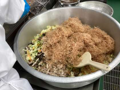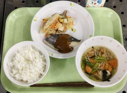 今日は、ごはん、魚の香味焼き、りっちゃんの元気サラダ、そうめん汁、牛乳です。