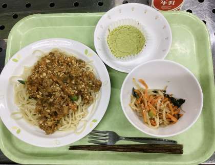 今日は、ジャージャー麺、ナムル、抹茶のチーズケーキ、牛乳です。