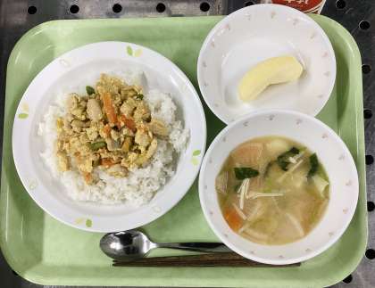今日は、衣笠丼、京風みそ汁、りんご、牛乳です。