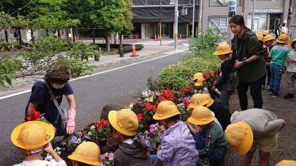 今日の1校時は、笹原小学校の敷地外歩道に地域の方と一緒に花植えをしました。