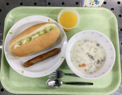 今日は、セルフホットドッグ、クリームシチュー、オレンジゼリー、牛乳です。