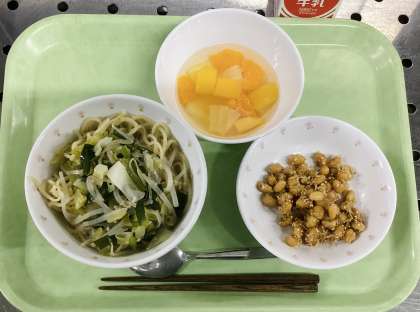 今日は、塩ラーメン、大豆とじゃこの甘辛あげ、フルーツポンチ、牛乳です。