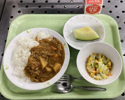 今日は、ポークカレーライス、コーンサラダ、メロン、牛乳です。