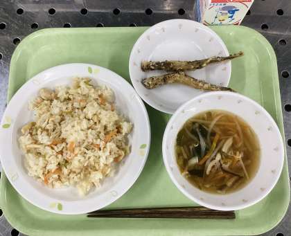 今日は、子ぎつねごはん、ししゃもの二色揚げ、沢煮椀、牛乳です。