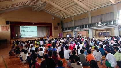 今日は、体育館でアニメのキャラクターあて集会を行いました。