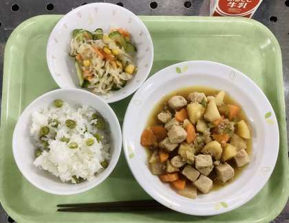 今日は、ピースごはん、じゃがいものそぼろ煮、切干大根の和風サラダ、牛乳です。