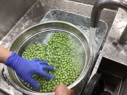今日は、1年生が頑張ってさやむきしてくれたグリーンピースをごはんと一緒に炊いて提供しました。