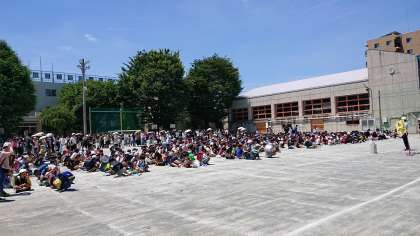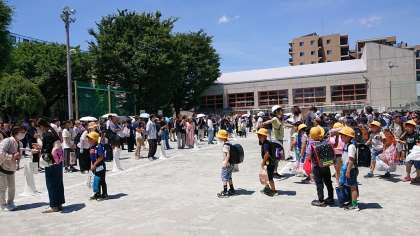 昨年は雨天のため、教室での引き渡しでしたが、今年は校庭での引き渡しができました。