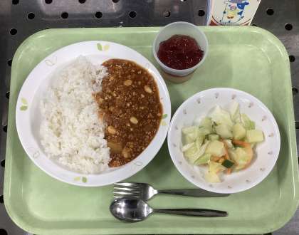 今日は、チリコンカーンライス、ポテト入りフレンチサラダ、あじさいゼリー、牛乳です。