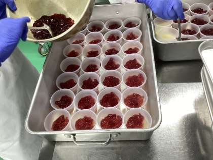 下にはりんごゼリーを流し入れ、その上にはぶどうゼリーを砕いたものをかけて作っています。