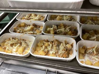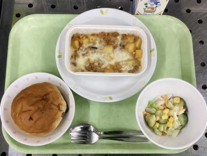 今日は、ぶどうパン、ムサカ、オニオンドレッシングサラダ、牛乳です。