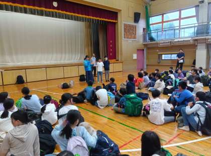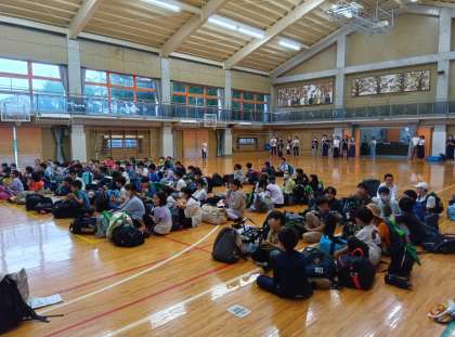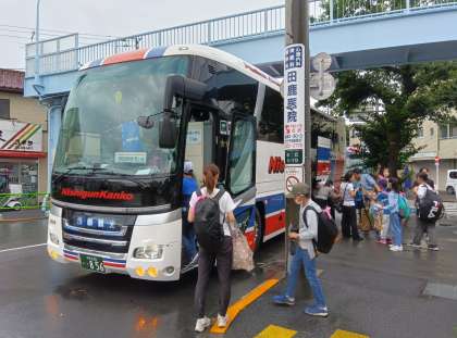 実行委員の子どもたちの司会で体育館で出発式を行いました。移動教室のスローガンは「仲良く 楽しく みんなの笑顔が 思い出に」です。初めての移動教室に、ちょっと緊張気味の子どもたちもいるようですが、見送りの家族や先生方に手を振り、みんな笑顔で出発できました。