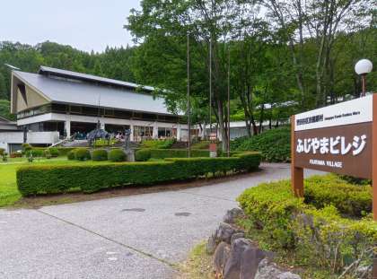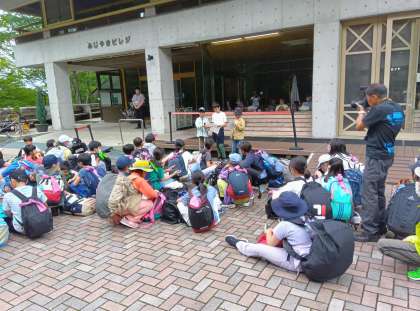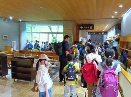 午前11時55分、予定通り宿舎のふじやまビレジに到着しました。行きのバスでは乗り物酔いした人もなく全員元気です。宿舎前のお祭り広場で開室式を行いました。