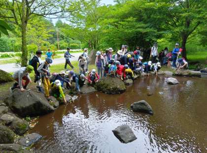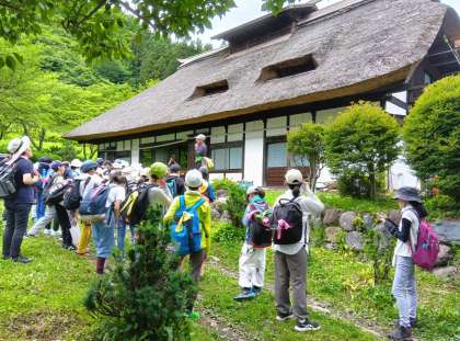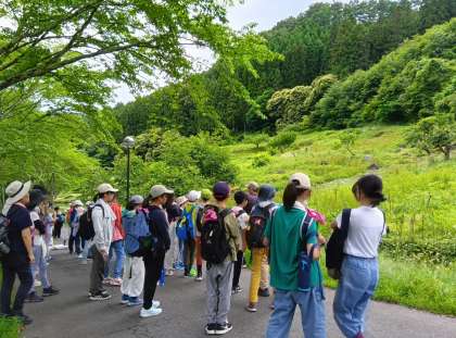 14時から川場里山入門をガイドさんの案内で行いました。宿舎のふじやまビレジ周辺を散策しながら、里山の自然や生き物、暮らしについて学びました。