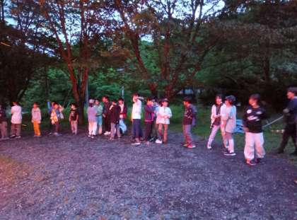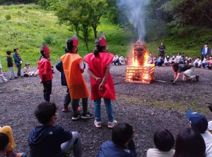 18時50分からキャンプファイヤーを行いました。火の神と火の子による中央の薪への点火の後、歌やソーラン節のダンス、ゲームを楽しみました。キャンプファイヤー係の皆さんが、進行を頑張りました。今日の午後は世田谷は雨が降っていたようでしたが、川場村はずっと晴れていて、予定通りの活動を行うことができました。この後、入浴して21時30分には消灯の予定です。みんな元気です。