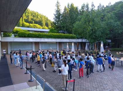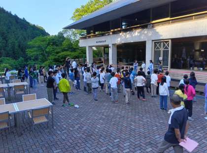6時に起床。朝の健康観察でも具合が悪い子は見られず、みんな元気です。6時30分より朝の会を行いました。天気は晴れ、気温は18度でとても気持ちのよい朝となりました。実行委員さんの司会、朝の体操と小気味よく会が進みました。このあと朝食を食べ、8時30分より登山に出発します。