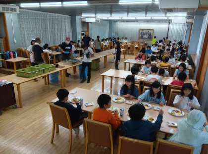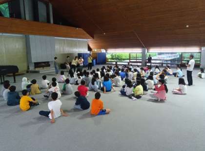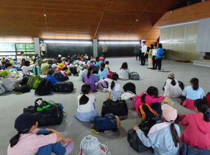 未明から強い雨が降っていたため、室内で朝の集いを行いました。その後、宿舎で最後の食事をいただきました。荷物の整理や部屋の片付けをして、8時45分から室内で閉室式を行い、宿舎のふじやまビレジの皆様に感謝の言葉を伝えました。そして5年生の普段の行いがよいのでしょうか、閉室式を行っている頃に、外の雨は止みました。この後、移動教室最後の活動の「村めぐり」は傘なしで行えそうです。