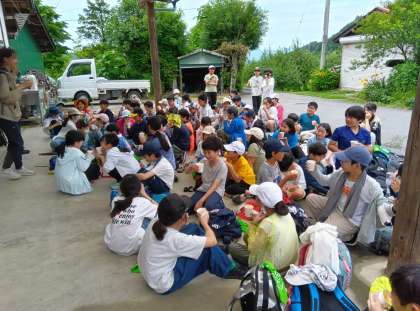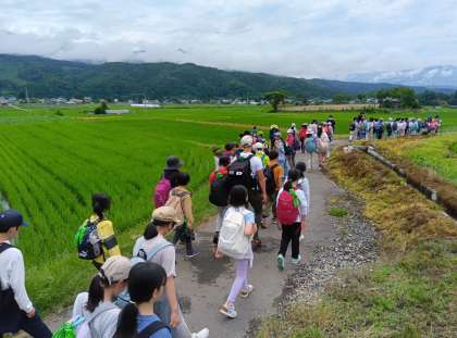 9時から、川場移動教室最後の活動となる村めぐりを行いました。田園の長閑な景色や用水路の水のせせらぐ音を楽しみながら、のんびり散策しました。10時30分に関りんご園さんに到着し、美味しいりんごジュースをいただきました。「蜂蜜が入っているのですか?」と子どもたちがりんご農家さんに質問するほど、甘くて濃厚なりんごジュース。もちろん原材料はりんごのみでした。この後、田園プラザで昼食ををいただき、帰校の途につきます。