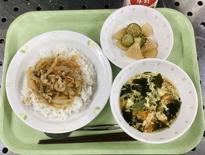 今日は、おろし豚丼、ピリ辛大根、わかたま汁、牛乳です。