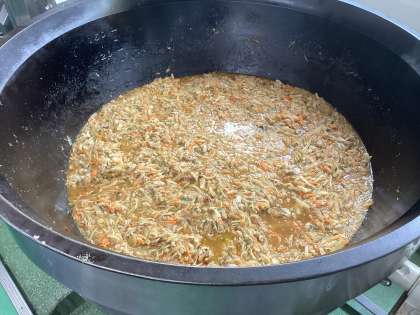 おろし豚丼には、大根おろしと豚肉だけでなく、玉ねぎやもやし、こねぎを入れています。野菜がたっぷりです。さらには、しそを入れて風味よく、さらにさっぱりいただけるよう仕上げています。